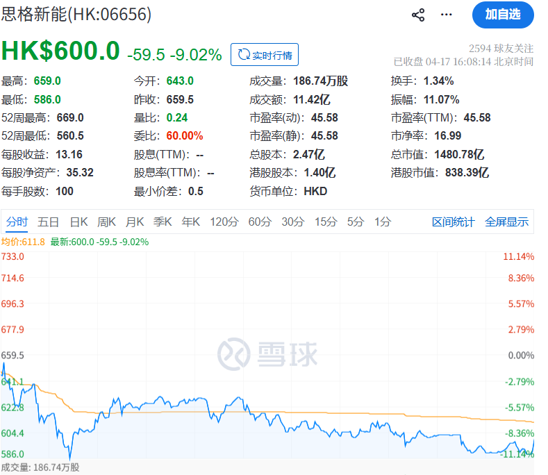 竣事4月17日收盘,想格新能股价较上一日下降9.02%,报600港元,公司总市值降至1480.78亿港元。