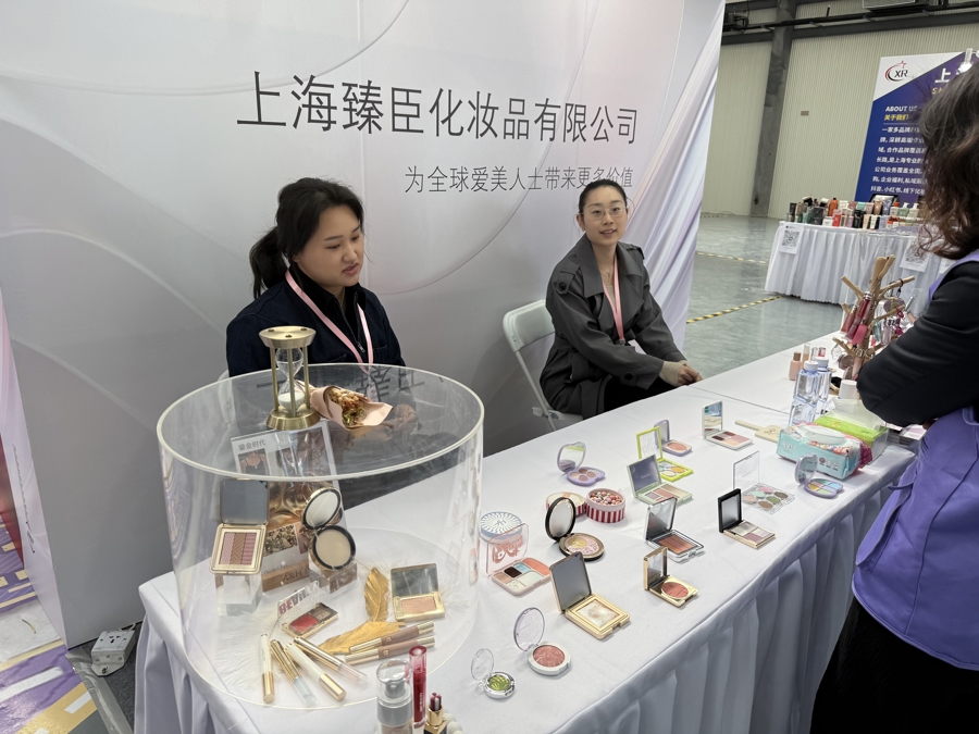 庄行好意思妆节展台,oem企业展示居品。沈想怡 摄