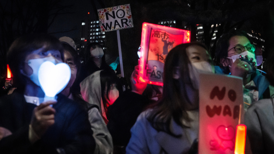 4月8日晚,大都日本全球在位于东京的国会议事堂前王人集,抗议高市早苗政府部署汉典导弹、企图解禁杀伤性火器出口等破损和平宪法的动向。\n 新华社发