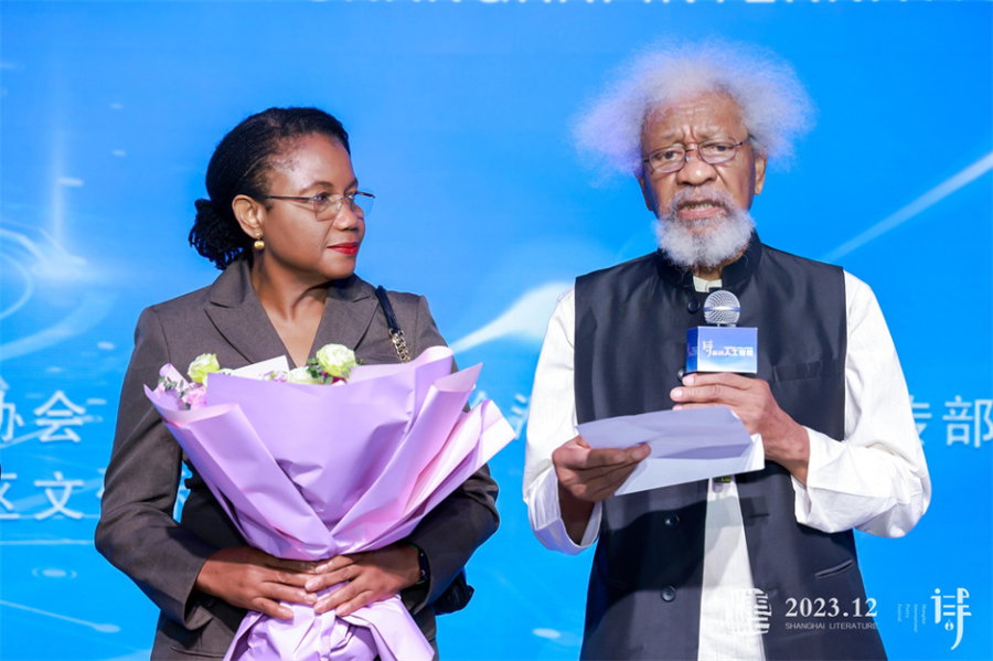 索因卡在夫人陪伴下领取“金玉兰”诗歌大奖。图IC
